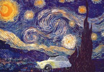 All of van Donk’s energy became focused on the car and in 1950 he managed to scrape together enough money to buy a 2CV. He then left Paris and drove down to southern France, where under the burning sun of Provence he painted scenes of the fields, cypress trees, peasants and the 2CV. During this period, living at Arles, he began to use the swirling brush strokes and intense yellows, greens and blues associated with such typical works as 2CV at Arles (1950) and Starry 2CV (1951).