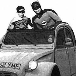 POW! BIFF! ZONK! WHAM! below the mansion is the secret Batcave, the greatest anti-crime laboratory in the world, powered by nuclear energy. The entrance to this amazing Batcave is hidden behind a bookcase hiding the Batpoles down which Batman slides. The Batcave also garages the nuclear-powered Bat2CV, a supercar with built in parachutes and numerous other scientific devices, including the Batscope, a radar detection device, and a tv screen with a revolving closed circuit camera.